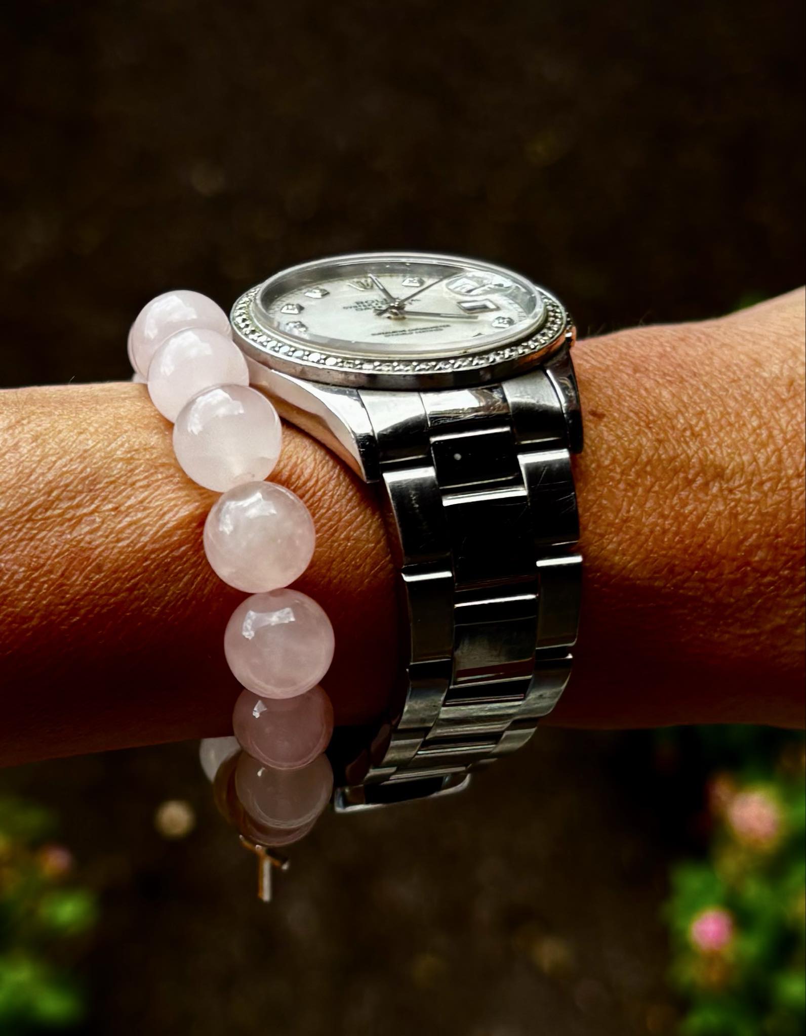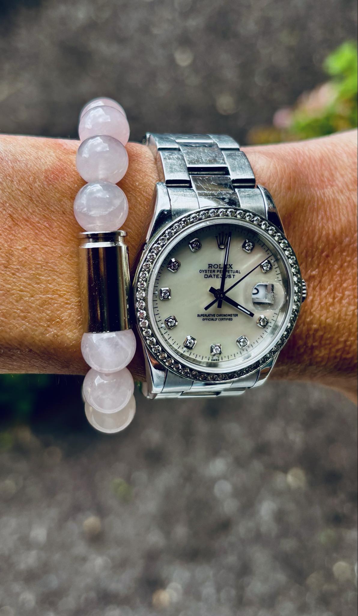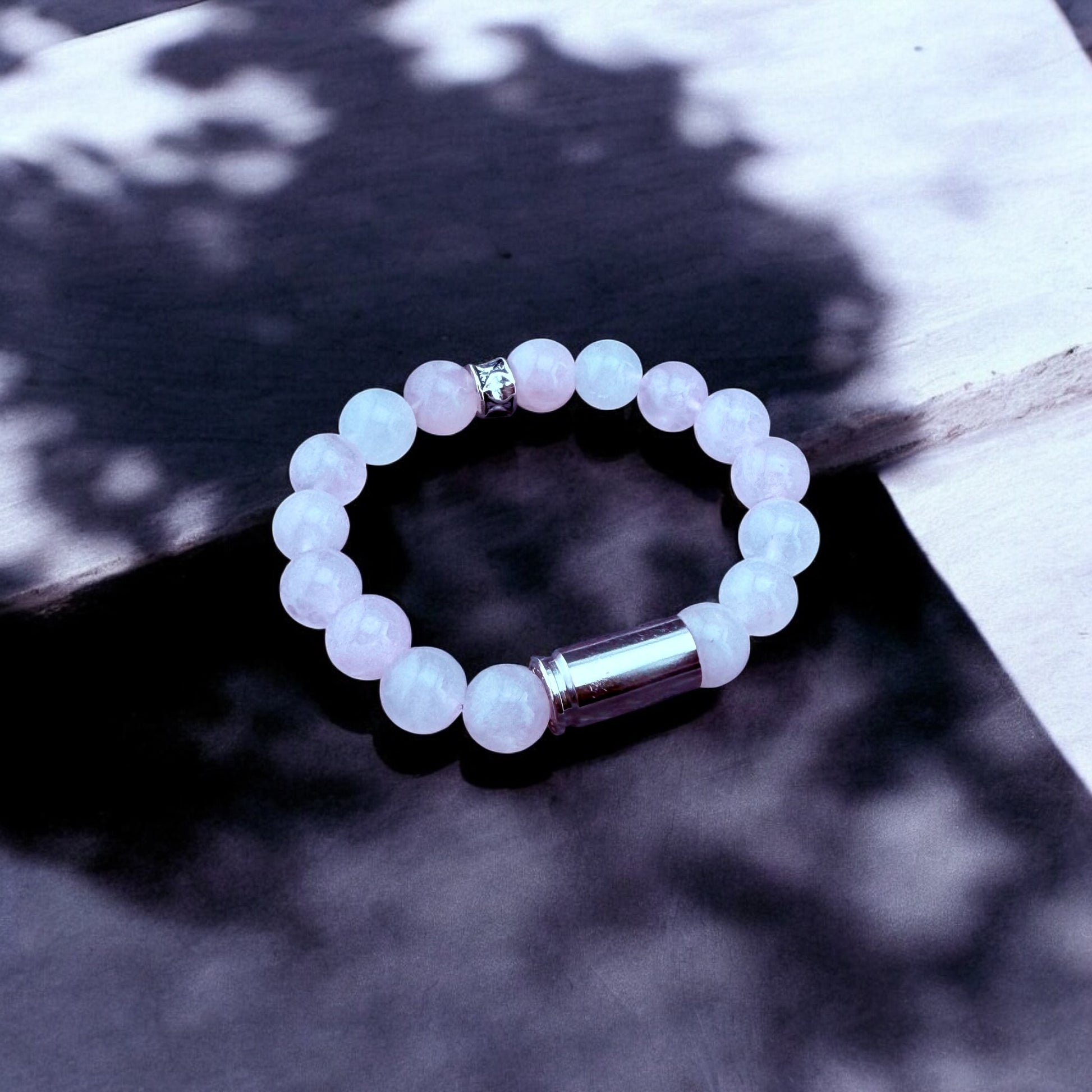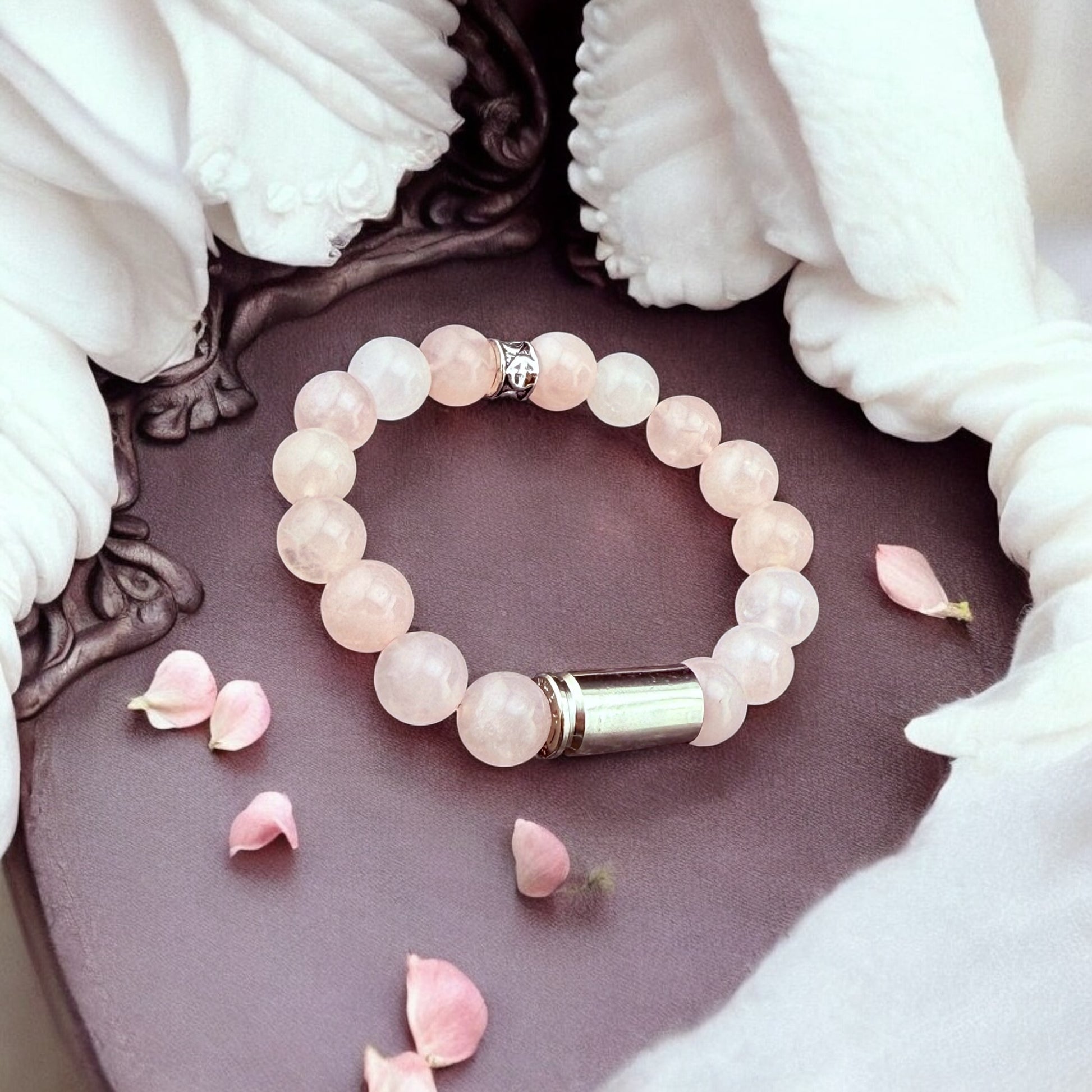 The Angel Armor bracelet is a unique, handcrafted piece featuring Rose Quartz and a 9mm casing.